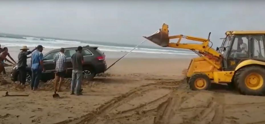 La marée est maintenant basse, le sable toujours impraticables et le véhicule ne démarre plus. On accrocha une corde bien résistante à la grande pelle de l’engin et à l’arrière de mon véhicule, qui réussit à le soulever et le déplacer de quelques mètres.