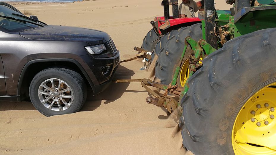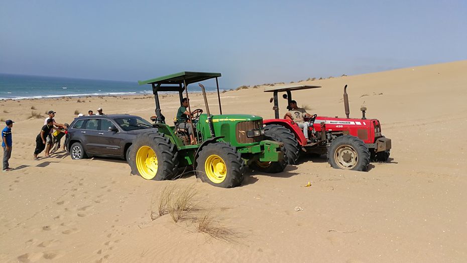Nous avons accroché le 4×4 à deux tracteurs avec des cordes et ils ont réussi à la tracter sur 500 mètres. Une fois arrivés à la grande dune, les engins ont ralenti, non pas par manque de puissance mais à cause du sable, leurs roues commençant à tourner dans le vide et à s’enfoncer petit à petit dans le sable. Impossible d’avancer.